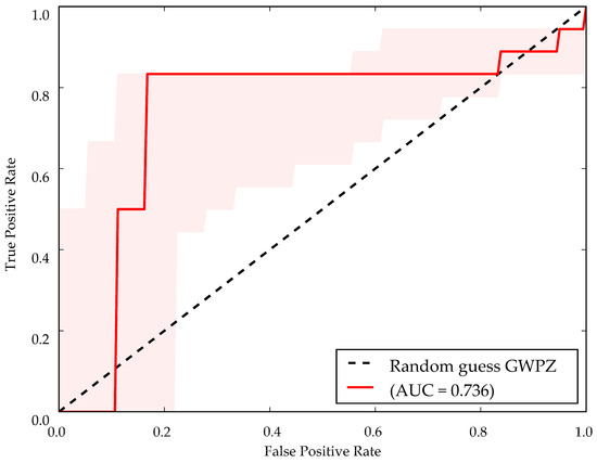 Furthermore, this study conducted a quantitative validation of the predicted groundwater prospect map using the receiver operating characteristic (ROC) curve, as shown in Figure 10. This validation involved comparing the groundwater level data with the generated map, and the ROC tool in the ArcSDM module was employed for this purpose. The ROC curve illustrates the relationship between the true positive rate and the false positive rate across different threshold cutoff points for a given variable. Additionally, the area under the curve (AUC) serves as a measure of how effectively a parameter distinguishes between two diagnostic groups. Every point on the ROC curve indicates a pair of sensitivity values that correlate to a specific decision threshold. AUC values within the range of 0.5–0.6 indicate poor prediction accuracy, while ranges of 0.6–0.7, 0.7–0.8, 0.8–0.9, and 0.9–1 signify average, good, very good, and excellent prediction accuracy, respectively, for the relationship between the AUC and the prediction accuracy [56,57]. The validation results demonstrated good prediction accuracy using the Analytical Hierarchical Process (AHP) technique, as the AUC of the GWPZ map was calculated to be 0.736.