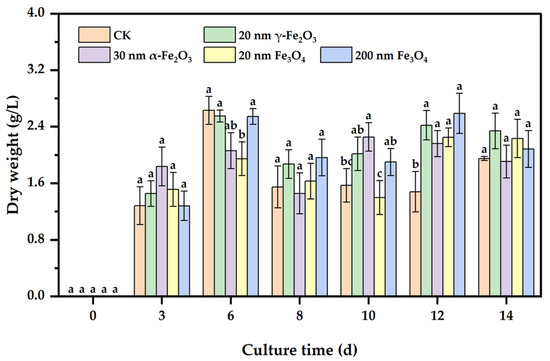 Effect of nano iron oxides on the growth of Phanerochaete chrysosporium. Different letters indicated significant differences between the treatments (p < 0.05).