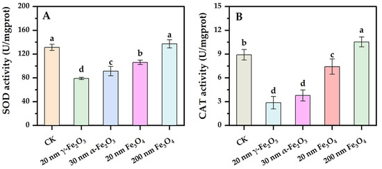 An antioxidant defense system was developed in organisms to scavenge excess viable oxygen species timely before damage was caused to intracellular components, thus mitigating the toxic effects of oxidative stress on organisms [24]. Antioxidant enzymes are the main composition in the antioxidant defense system, and SOD and CAT are two functional enzymes involved in antioxidant defense [25]. The effects of different nano iron oxides on the intracellular activities of SOD and CAT in Phanerochaete chrysosporium are shown in Figure 3. As shown in Figure 3A, the 20 nm Fe3O4 group, 30 nm α-Fe2O3 group and 20 nm γ-Fe2O3 group significantly inhibited intracellular SOD activity compared to the control group, with the most significant one being the 20 nm γ-Fe2O3 group, whereas there was no significant difference between the 200 nm Fe3O4 group and the control group, where even the intracellular SOD activity was a little higher in the 200 nm Fe3O4 group than the control group. In Figure 3B, there were significant differences between both the control and nano iron oxides groups, in which the 200 nm Fe3O4 group significantly increased the intracellular CAT activity, while the 20 nm Fe3O4 group, the 30 nm α-Fe2O3 group and the 20 nm γ-Fe2O3 group significantly inhibited the intracellular CAT activity. The two antioxidant enzymes had a synergistic effect in resisting oxidative stress, with SOD first converting superoxide anion radicals to H2O2, before CAT completely detoxified H2O2 to H2O and O2 [23]. The results demonstrated that the addition of nano iron oxides except 200 nm Fe3O4 probably induced the consumption or the inhibition of SOD and CAT in Phanerochaete chrysosporium, and these changes were more significant in the group with a smaller size Fe2O3.
