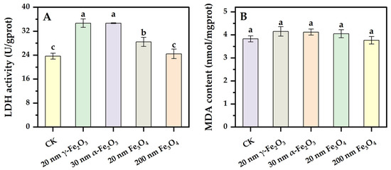 Effect of nano iron oxides on extracellular LDH activity and intracellular MDA content in Phanerochaete chrysosporium ((A): LDH, (B): MDA). Different letters indicated significant differences between the treatments (p < 0.05).