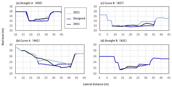 Figure 3 shows a comparison of representative cross-sections before alterations, planned cross-sections (generally after excavation), and the results of the 2021 survey. In curve A, where the low flow width narrowed, as shown in Figure 3b, sediment deposition was observed on the inner bank side as of 2021, but the riverbed’s height was lower than that before construction. The low flow width was 7 m compared to 1 m before. The thalweg previously located at the center of the cross-section shifted outward due to the erosion that occurred along the outer bank. This also contributed to forming a pool habitat. Thus, we found that the spur dikes succeeded in controlling the inner bank’s point bar and maintaining a low flow width; however, they did not control the bed erosion along the outer bank in this section. In curve B, no significant bed erosion was observed. Sediment deposition was found particularly at the inner side of the bend’s entrance. This indicates that the spur dike worked differently in this section. The flood in 2018 exhibited the largest magnitude since 2011. However, past photographs show that sedimentation was not significant in 2019 and that it was higher in 2021 (Figure 4c).
