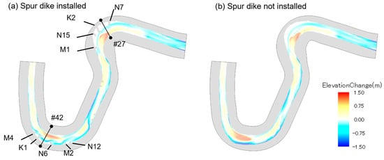 Figure 11 depicts the distribution of water depths for low flow (0.2 m3/s, observation-based) conditions after a flood-induced morphodynamic bed level change, and the results were compared with respect to whether spur dikes were installed. In the calculation results with a spur dike at curve A, scouring was observed near the tip of the dike. Bed erosion along the riverbank was also observed in the back half of the bend. However, the calculation underestimated the extent of observed erosion, which was more extensive. The calculation with the spur dike did not reproduce the broad and deep thalweg that formed due to extensive erosion along the revetment. The flow at cross-section #42 had a surface width of more than 7 m and a depth of 1 m, suggesting that the erosion that occurs at the tip of the spur dike—which is reflected in calculation results—together with secondary flow caused by the bend and local scouring around the spur dike has multiple effects. It forms a broad thalweg at the reach, which can be expected to provide essential habitats for organisms due to its conditions as a pool.