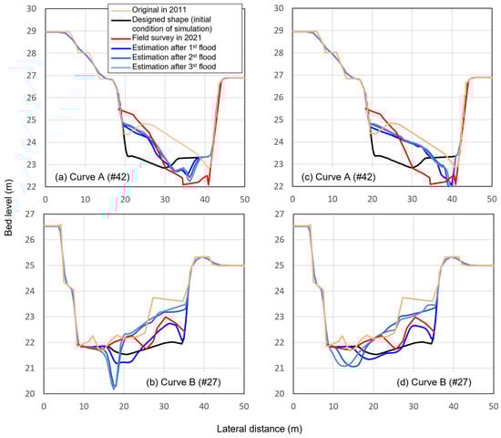 In this study, the computational grid was set at a size of approximately < 0.5 m to resolve the spur dikes, as shown in Figure 3. The cells with respect to spur dikes and riverbank revetments are fixed bed cells. For the boundary flow condition, we focused on floods that occurred on 10 July 2014 (Qmax = 138 m3/s) because the photographs showed that the riverbed in curve A became stable after 2014. Past photos showed that outer bank scouring was observed in 2015 at bend A, and the situation was almost the same as that in the present condition. The flood in 2014 was the third largest during the period from construction to 2021, and scouring was likely caused by this flood. In the simulation, we input three hydrographs of the 2014 flood to the simulation model to examine sustainability relative to sedimentation in the target sections. As described in Section 3.3.1, simulation conditions other than the flow rate, including the initial bed level, sediment diameter, and Manning’s n, were the same as those used in the 1D model analysis.