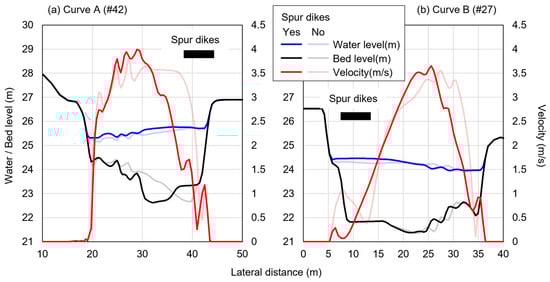 Lateral distributions of water level, bed level, and velocity at the first high flow in 2D simulations: (a) curve A (#42) and (b) curve B (#27).