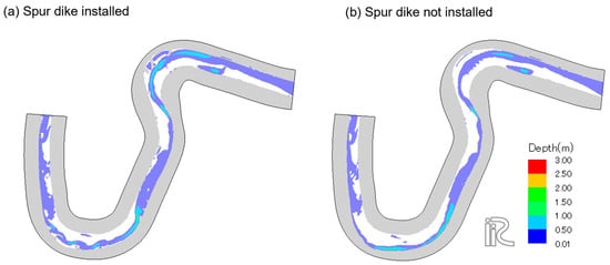 Flow depth results at low flow conditions estimated by two-dimensional morphodynamic simulations for (a) installed or (b) uninstalled spur dikes.