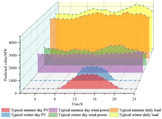 For the joint power generation system constructed above, representative typical days were selected for a scenario analysis based on historical data pertaining to regional wind, along with photovoltaic and load power. The selection of typical days is mainly based on the following principles. First, in the energy base region, wind and solar power exhibit different generation patterns in different seasons, with both having distinct seasonal characteristics. Solar power output shows a trend of being stronger in summer and weaker in winter, while overall, wind power output exhibits a stronger trend in winter and a weaker trend in summer. This study focused on seasons with pronounced seasonal features, namely, summer and winter. In this study, the daily load curves of the day with the maximum load in summer and winter were chosen as the typical daily load curves. Ultimately, based on historical data regarding wind power, solar power, and load in the energy base region, 31st July and 18th December were selected as typical days for this study, representing the days with maximum load during the summer and winter periods. The specific output conditions are illustrated in Figure 2. The system load was greater between 08:00 and 23:00, suggesting that this is the time period when power consumption is at its highest. Between 01:00 and 07:00, the load was lower and steadier, with the winter load value being higher than the summer one. The major time that solar power plants contribute is during the day. The trend regarding photovoltaic power generation is consistent with the direction of load fluctuations throughout the year, and it has a good peak regulation impact. With anti-peak control, wind power generation exhibits high seasonality and unpredictability. Figure 2 also shows that while summer wind power output is generally constant, winter oscillations are more pronounced and also depend on the local climate.