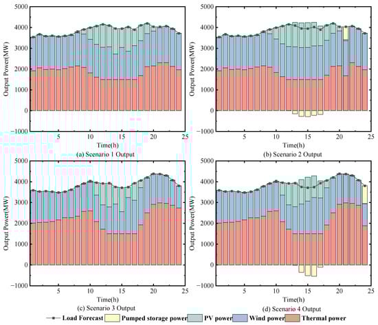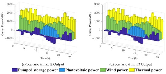 Figure 3 displays the output power of the day-ahead optimized scheduling for the combined power generation system in four situations. Figure 3a,c show the day-ahead dispatching results for wind, photovoltaic, and thermal power when there are no pumped storage power stations in the system; Figure 3b,d show the day-ahead dispatching results for pumped storage, wind, photovoltaic, and thermal power when there are pumped storage power stations in the system. The operating expenses, CO2 emissions, thermal power production volatility, and wind and light emissions of the combined power generation system were determined by solving the day-ahead optimization scheduling model of the combined power generation system, as shown in Table 6.
