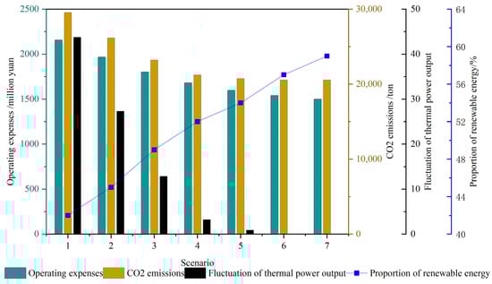 Figure 4 and Table 7 show that the combined system’s operating costs continue to decline as the proportion of new energy in the system rises. The carbon emission and volatility of thermal power plants both exhibit a pattern of first dropping and then remaining unchanged.