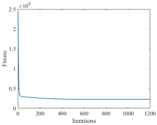 The parameters of the PSO algorithm are shown below: inertia weights minimum , inertia weights maximum , learning factor , learning factor , population size 200, maximum number of iterations 1200. The variation in the objective function value during the optimization process using the PSO algorithm is illustrated in Figure 5. The descending trend of the fitness curve reflects the process of the particle swarm algorithm searching for the global optimum. The decrease in the curve indicates that the particle swarm is gradually approaching the optimal solution within the search space. It can be observed that the fitness curve tends to stabilize after 800 iterations, indicating that the algorithm has converged to the global optimum, and subsequent iterations do not significantly improve the objective function value. The indicators of the co−generation system in scenarios 1 and 2 are shown in Table 8.