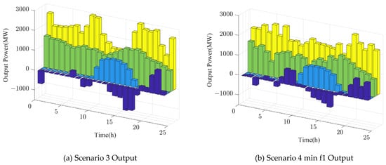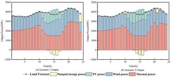 The output power values of each power supply in scenario 1 and scenario 2 in Scheme 3 are shown in Figure 6. Based on the optimization results, CPLEX obtains lower operating costs, lower carbon emissions, and a slightly larger fluctuation in thermal power output than the PSO algorithm, and there is no wind and light abandonment in both scenarios; based on the day−ahead optimal scheduling results, the two results are basically the same, and there are some differences in the time of pumped storage power generation conditions, which verifies the correctness of the CPLEX solution.