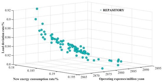 Scenarios 3 and 4 are both multi-objective models which can be solved directly by using the MOPSO algorithm, while the CPLEX solver needs to transform the multi-objective problem into a single-objective problem by weighting before solving. The parameters of MOSPO are as follows: , , , , population size 200, number of non-dominated solutions 100, maximum number of iterations 500. The set of Pareto optimal solutions for the three objective functions of scenarios 3 and 4 is shown in Figure 7, and the values of each objective function for the co-generation system are shown in Table 9.