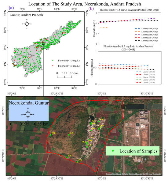 (a) Location of the study area showing Neerukonda village in Andhra Pradesh and sampling points. (b) Trend of fluoride levels (>1.5 mg/L and <1.5 mg/L) in Andhra Pradesh.