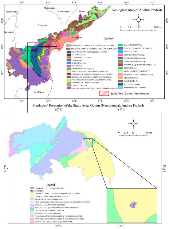 Map showing different geological formations of Andhra Pradesh and Guntur district with locations of the sample points in the study area.