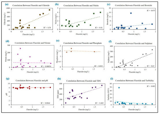 Correlation and trends between (a) fluoride and chloride, (b)fluoride and nitrite, (c) fluoride and bromide, (d) fluoride and nitrate, (e) fluoride and phosphate, (f) fluoride and sulphate, (g) fluoride and pH, (h) fluoride and TDS, and (i) fluoride and turbidity.