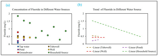 (a) Fluoride concentration in the study area. (b) Trend of fluoride concentration in different water sources.
