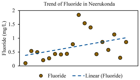 The water samples from the study area were collected from different water sources including a deep well, surface water bodies (pond), and household tanks. Fluoride concentration was detected, and the descriptive statistics of the fluoride concentrations along with other physicochemical parameters of water are provided in Table 1. The average F− concentration of the study area across all sources is 0.7 mg/L. The fluoride concentration ranged from 0.10 to 1.84 (SD ± 0.7) (Table 1). However, the variation in fluoride concentration depending on the sources was observed in different sampling locations of the study area. The highest fluoride concentrations were observed (>1.5 mg/L) in two locations out of all the samples (H2 and H3) in Neerukonda. The fluoride concentrations in two other samples ranged between 1.5 and 1.0 mg/L, whereas the remaining 14 samples showed a concentration of below 1 mg/L (Table 3) (Figure 6a). Sector–wise, the trend in fluoride concentration showed a different pattern for different water sources (Figure 6b). The trend of fluoride in household and tubewell water samples showed a decreasing trend, while an increasing trend was observed for surface water bodies and well water (Figure 6b). But as an aggregate of all water sources, a positive trend in fluoride concentration was observed in the study area (Figure 7). It is important to note that the WHO (2017) recommendation states that fluoride concentration in drinking water should be maintained between 0.5 and 1.5 mg/L [13]. Therefore, the samples with fluoride concentrations greater than 1.5 mg/L could be of high concern, and appropriate measures should be taken to ensure the safety of drinking water.