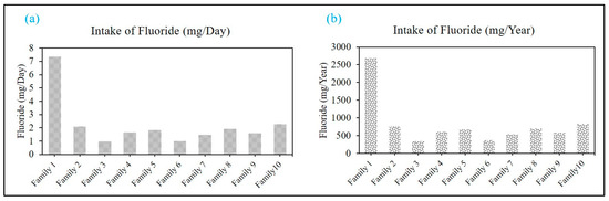 Freshwater is one of the main basic needs for human consumption, but this valuable resource is under threat due to natural and anthropogenic drivers. This study revealed the consumption pattern of drinking water by surveying ten families from Neerukonda and exposed their fluoride consumption pattern. In addition, the study also revealed the future intake capacity of fluoride, which will further shed light on major health cautions. It has been observed from all families that family-1, which relies on underground tap water (D1) as their primary source of drinking water, has the highest consumption of F− (~7.5 mg/day, 2684 mg/year) (Table 4) (Figure 8a,b). On closer examination of family-1′s data, it can be inferred that the use of underground tap water as a source of drinking water indirectly results in a high level of fluoride intake. Family-10 is the second highest (~828 mg/year) fluoride consumer in drinking water, whereas family-2 (767 mg/year), family-4 (606 mg/year), family-5 (~667 mg/year), and family-8 (706 mg/year) have a consumption rate between 600–770 mg/year (Table 4, Figure 8b), and the remaining families have a lower consumption pattern (300–550 mg/L) (Table 4, Figure 8b). Upon a closer examination of Table 5 summarizing characteristics regarding family-1, it was reported that their water consumption amounts to a minimum of 3–4 L, resulting in a fluorine uptake of 3.8–3.5 mg/L, exceeding the permissible limit by two–fold. Over time, this accumulation of fluoride can result in severe health complications. It is worth noting that these individuals lack formal education, emphasizing the critical need to raise awareness regarding the risks associated with their water consumption habits.