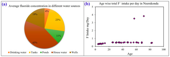 (a) Average fluoride concentration in different water sources. (b) Total intake of fluoride per day in Neerukonda.
