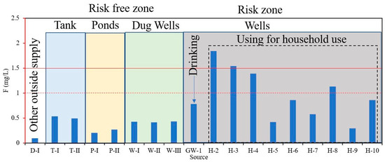 A household survey was conducted to record the water intake of different age groups. A subsequent analysis of age–based intake of fluoride was conducted (Figure 9b). The highest consumption was found in the 50–80 age group (Figure 9b). The survey revealed a common misconception that boiling drinking water can solve the problem of excessive fluoride content. However, the reality is that boiling can increase the fluoride concentration as the water evaporates and the fluoride ions remain behind. As a result, the remaining water becomes more concentrated with fluoride. To estimate the minimum and maximum exposure doses of fluoride, the mean, minimum, and maximum range of water fluoride levels was calculated (Table 6, Figure 9a). The study revealed the fluoride content in different water sources of Neerukonda (Figure 9). It identified the risk–free zones and risk zones for varying water sources and suggested what purpose the water can be used for at different fluoride concentration levels (Figure 10). Well water falls under high–risk zone which can be used only for household or domestic purposes and should be avoided for drinking needs (Figure 10). Water from other sources like deep groundwater and tanks can be used for drinking purposes as mentioned (Figure 10). The red dashed line shows the F− of 1 mg/L and red solid line shows the F− concentration is more than 1.5 mg/L (Figure 10).