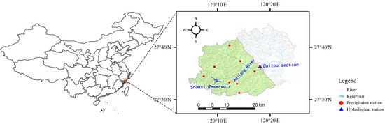 The Daitou catchment from the Aojiang River basin was selected as the study area. The Aojiang River basin is in Zhejiang Province, southeast of China, with an area of 1544 km2. As a typical tidal bore river, the Aojiang River has a unique aquatic ecosystem. The Daitou section, with a catchment of 346 km2 and located in the mainstream of the Aojiang River, is one of the most important control sections for the water demand of aquatic organisms in the lower reaches. However, with urban developments and population growth, the streamflow of the Daitou section is increasingly affected by human activities. In 2014, the Shunxi Reservoir in the upper reaches of the Daitou section (approximately 25 km away) was built. The Shunxi Reservoir is a water conservancy project with comprehensive utilization functions, such as flood control, water supply, irrigation, and power generation. The total storage capacity of the reservoir is 42.65 million m3, and the catchment area is 92.3 km2. According to records from the government of Pingyang County, the streamflow of the Daitou section has undergone great changes in recent years because of the influence of reservoir water storage and release, and the aquatic ecosystem has been affected by droughts multiple times due to an insufficient streamflow. It is an important and meaningful task to build a framework to forecast and analyze ecological droughts of the Daitou section. Therefore, the catchment above the Daitou section was selected as the study area in this study. The area, main water conservancy projects and precipitation/hydrological stations of the Daitou catchment are shown in Figure 1.