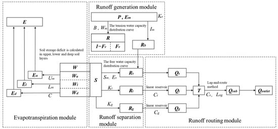 The Xin’anjiang hydrological model (XAJ model), developed by Zhao in the 1970s, is a semi-distributed conceptual rainfall–runoff model and has been widely used for hydrological simulations in China. The main assumption of the XAJ model is that saturation-excess runoff occurs without further loss when the aeration zone reaches its field capacity. As shown in Figure 2, there are four major modules for the model, namely, the evapotranspiration module, the runoff generation module, the runoff separation module, and the runoff routing module. Additionally, there are two major input variables for the XAJ model, which are the measured areal mean rainfall depth ( in Figure 2) and pan evaporation ( in Figure 2). The descriptions of the model variables of Figure 2 are shown in Table 1. More detailed information about the XAJ model can be found in [40,41].