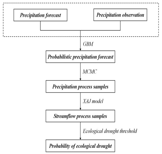Through the probabilistic precipitation forecast model, the probability distribution of precipitation can be obtained when the forecast value is known. In this paper, we assumed that the probability distribution of precipitation from different lead times was independent and sampled the probability distribution of precipitation from different lead times by the Monte Carlo Markov chain (MCMC) method to generate multiple groups of precipitation processes. Therefore, the probabilistic ecological drought forecast includes the following three major steps, and a flowchart of the probabilistic ecological drought forecast is shown in Figure 3.