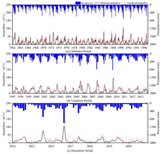 Observed and simulated monthly streamflow series for the Daitou section. (a) Calibration period (1962–1996), (b) validation period (1997–2013), and (c) simulation period (2014–2020).