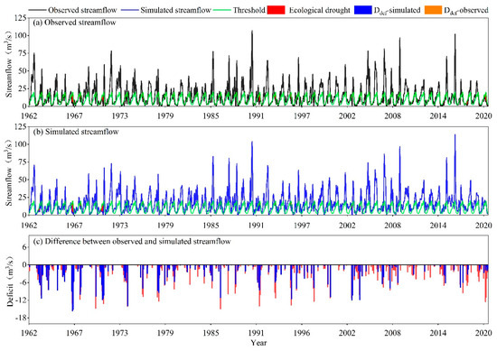The identification of ecological drought events for the observation and simulation series at the Daitou section from 1962 to 2020, and the corresponding ecological drought deficit volumes. In this figure, and represent the deficit volume of ecological droughts from the simulated and observed streamflow series, respectively. (a) Observed streamflow series, (b) simulated streamflow series, (c) differences between observed and simulated streamflow series.