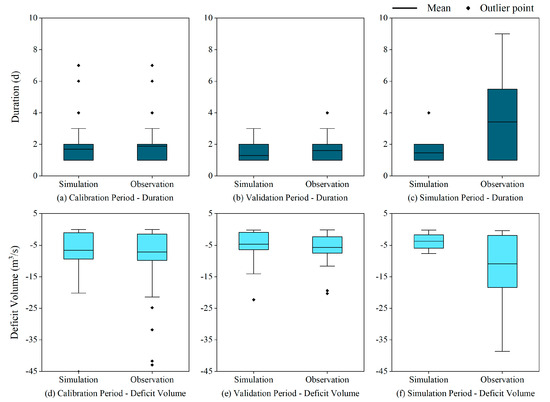 The boxplots of the duration and deficit volume for ecological drought events from the observation and simulation series during the calibration, validation, and simulation periods. (a) Durations of the ecological drought events in the calibration period, (b) durations of the ecological drought events in the validation period, (c) durations of the ecological drought events in the simulation period, (d) deficit volumes of the ecological drought events in the calibration period, (e) deficit volumes of the ecological drought events in the validation period, (f) deficit volumes of the ecological drought events in the simulation period.