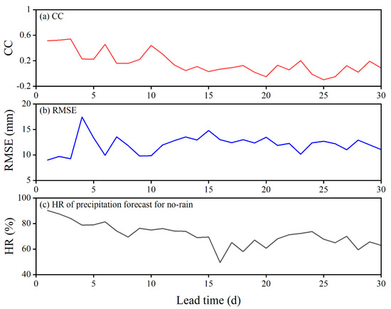 The accuracy of the precipitation forecasts was evaluated before conducting the ecological drought forecasts. The RMSE and CC of the precipitation forecasts from 2016 to 2020 for different lead times are presented in Figure 7a,b. The performance of the precipitation forecasts exhibited a downward trend as the lead time increased. There was a significant decrease in the accuracy of the precipitation forecasts when the lead time exceeded 3 d. The HR of no-rain forecasts is shown in Figure 7c. Compared to the results from the RMSE and CC, the HR for no rain also declined with the growth of lead time, but it could maintain a relatively high value with a long lead time (over 60% when the lead time was 30 d). These results indicate that the precipitation forecasts had better performance in no-rain conditions, which was crucial for ecological drought forecasts via precipitation forecasts.