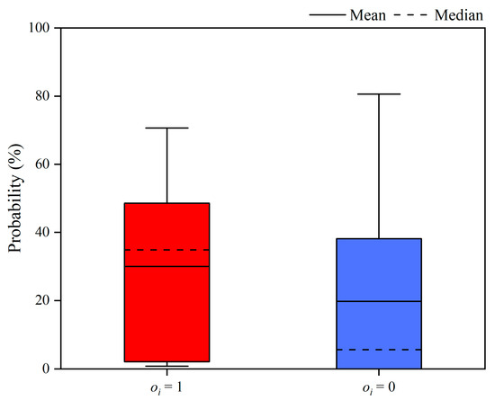 Although the no-rain forecast had a relatively high accuracy, it was inevitably affected by uncertainty, which may lead to incorrect ecological drought forecasts. Since the precipitation forecast data were from 2016 to 2020 and the streamflow of the Daitou section had already been affected by the Shunxi Reservoir during this period, the ecological drought events identified by the simulated streamflow from the XAJ model were used as the true value. The BS of the deterministic and probabilistic forecasts for ecological droughts are shown in Table 3. The results indicate that the probabilistic method was an effective way to improve the performance of ecological drought forecasts, decreasing the BS from 0.35 to 0.18. Additionally, when ecological droughts truly occurred (i.e., ), the average forecasted probability of occurrence was 30.0%. On the other hand, when ecological droughts did not occur (i.e., ), the average probability forecasted by the model was 19.7%. To remove the influence of extreme values, more attention should be given to the median rather than the average. The medians for the cases of and were 34.9% and 5.6%, respectively.