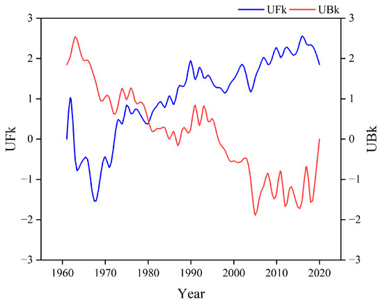 The MKT results for a changing-point analysis of the observed precipitation series. In this figure, is the value obtained in the forward order (from front to back), based on the time series; is the value obtained in the back order (from back to front), based on the time series; and the intersection of and is the changing point.