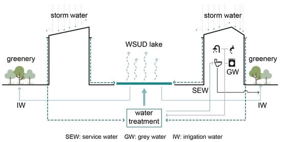 A WSUD project, which was designed based on an interdisciplinary understanding and the principles of WSUD [22,23,24], is under construction in the city of Mannheim at the time of the writing of this paper and expected to be finished by 2024. The project contains 74 residential units distributed in two multi-story family houses and offers a variety of different apartment types from 1.5 to 4.5 rooms with a total living space of 5888 m2. The two buildings are arranged in such a way that they form a courtyard with a naturally designed but technically controlled waterbody referred to as the WSUD lake from here onwards (Figure 1). The WSUD lake is a technical water reservoir fed by local storm water and surplus service water reclaimed from greywater from the apartments. It is designed to hold 120 m3 of water on average under normal operating conditions. It also has a provision for extension which enables the holding of an additional 50 m3 of water, which corresponds to a 100-year storm event. In order to allow unlimited access to the lakefront and to prevent any form of fencing, the level of the lake is limited to a depth of 0.4 m. The WSUD lake maintains a steady water level as it receives 100% of the storm water which is collected from the roofs and the façade of the development and the surplus of an integrated grey-to-service water system of the apartments. Though it is strongly dependent on the season, the storm water inflow accounts for between 60% and 90% of the overall reservoir capacity while service water accounts for the remaining 10% to 40% under normal operation conditions. The grey-to-service water system in the households is designed to collect grey water from showers, sinks and laundry. The grey water is then processed with the help of contemporary water reclamation technology such as ultrafiltration membrane to remove contaminants. This is followed by ultraviolet light exposure (UV) for disinfection, before the majority of it is pumped back to the apartments as service water, while the surplus of service water is spilled in the WSUD lake (Figure 2).