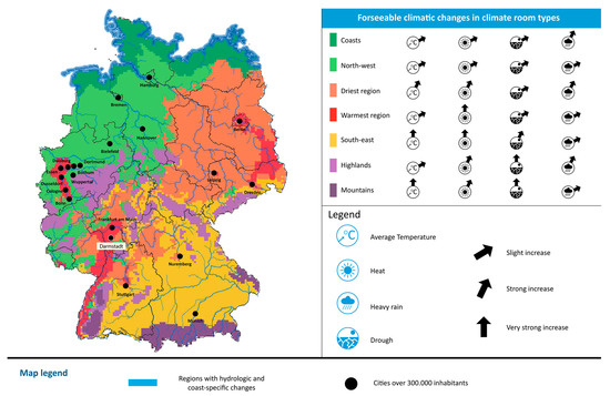 In 2021, the German Environment Agency (UBA) published its report, The Risks of Climate in Germany, where it clearly confirms that Germany will be affected by climate change nationwide [37,38]. It also noted that adverse effects such as heatwaves or heavy storm water will not be distributed evenly but impact differs regionally [38]. The overview map in Figure 3 illustrates how different parts of Germany, e.g., the coasts, the northwest and the mountainous regions, are exposed to either a minor, strong or very strong increase in four categories of risk, i.e., average temperature, heat, heavy storm water and drought.