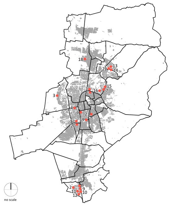 A total of 496 sites were examined in Darmstadt (Figure 4) against the indicators as described in Table 1. In the initial assessment, 19 sites met all the indicators. In the follow-up assessment, three additional sites were shortlisted despite not meeting all the stated indicators. These three sites, namely #3, #7 and #9, fell short of the minimum threshold indicator “number of units and/or grand total of living space” by only less than 9%, which the authors feel is not a significant enough shortfall to disregard their potential for inclusion in the study. Finally, a grand total of 22 sites were shortlisted for assessing the city-scale WSUD application. These sites account for 4.4% of all sites examined in the city of Darmstadt. Since most of the shortlisted sites are significantly large housing developments, they together represent 19% of all apartment units and 20% of total living space examined in the city with a population of about 6300 tenants.