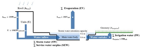 The preliminary steps are the basis for the monthly lake water balance (Figure 5). Water inflow through storm water refers to monthly averages (Table 3). Because site data do not include information on the nature of the roofs, SWmth is multiplied with the base area (Abase) of the buildings to approximate the total of storm water inflow. Additionally, inflow includes the surplus of service water per month (SEWsurplus) based on average consumption values applied in the design of the prototype and multiplied with the number of units (U). Lake outtake includes irrigation water and evaporation. The German weather service (DWD) provides data on evaporation for a lake depth of two meters. The deviation in the depth of the prototype is negligible because lake depth is not taken into account for the calculation of evaporation [53]. The total amount of irrigation water withdrawn from the lake is calculated by multiplying monthly irrigation averages (ØIRmth) with the irrigation area (Airrigation) of the site.