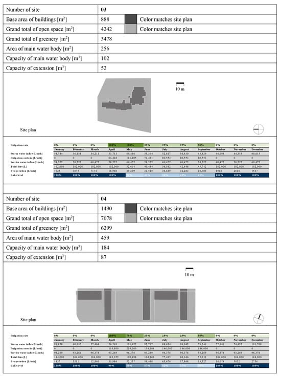 As an example, Figure 6 shows the lake water balance sheets for sites 03 and 04 alongside the corresponding site plan. Irrigation rates are reduced in gradations of , , , and referring to the greenery that is watered. As stated in the description of the prototype, lake levels must not fall below a capacity of 25%. Apart from this requirement lake levels must reach 100% when the irrigation phase begins in April.