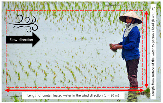Table 6 presents the physiological exposure coefficients and representative values applied in this study. In the case of agricultural activities, the reference data for the usage, usage hours, and usage frequency of agricultural canals as well as the skin exposure area (body surface area) were established considering 10 activities with the longest indoor/outdoor labor hours [21]. When the indoor agricultural labor VF was calculated, the standard value of the agricultural house size in Table 6 was considered. When outdoor agricultural labor VF was calculated, the body exposure of the pollutants was calculated using a box model, as shown in Figure 2.