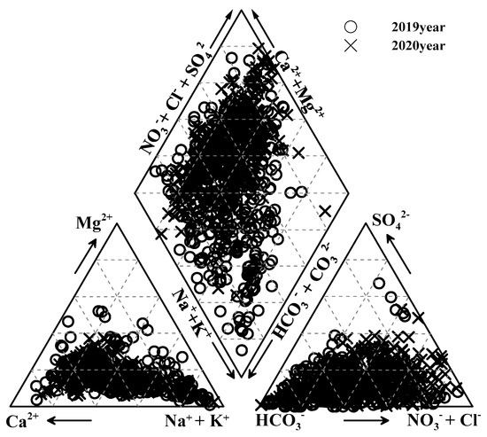A total of seven items in groundwater, including four major cations (Ca2+, Mg2+, Na+, and K+) and three anions (HCO3−, SO42−, and Cl−), were analyzed. The cations were analyzed using the standard method 3120 through the use of an ICP-OES analyzer (Optima 8300&7300DV, PerkinElmer, Shelton, CT, USA; 720-ES, Varian Inc., Palo Alto, CA, USA) [8]. Among the anions, SO42− and Cl− were analyzed using the anion–ion chromatography method in the water quality test standard using an IC analyzer (850 Professional, Metrohm, Herisau, Switzerland; ICS-5000+, Dionex Thermo Fisher Scientific, Waltham, MA, USA). HCO3− was analyzed through 0.05 N HCl titration in the field. The cation/anion analysis results were used for the classification of groundwater types using the Piper diagram. The Ca2+-HCO3− type represents shallow groundwater and the Ca2+-(Cl− + NO3−) type represents artificial contamination. The Na+-HCO3− type indicates the reaction between shallow groundwater and underground media, and the Na+-(Cl− + NO3−) type indicates the influence of seawater [9,10,11,12].