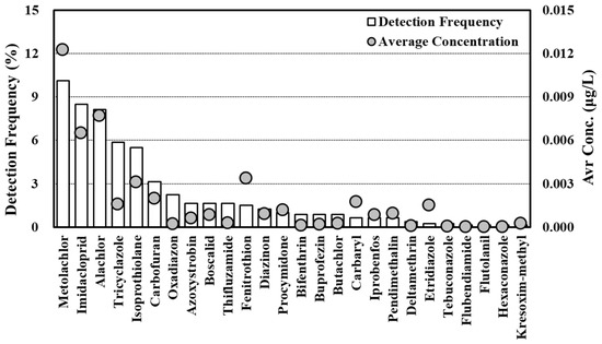 The results of the survey conducted twice a year at 50 points in the agricultural monitoring network (12 rice paddies, 19 fields, and 19 facility cultivation sites, for cultivation purposes) indicated that 18 pesticide items were detected (Figure 6). In the agricultural area, imidacloprid exhibited the highest detection frequency (18%) followed by metolachlor (13%), isoprothiolane (11%), alachlor (10%), and tricyclazole (10%).