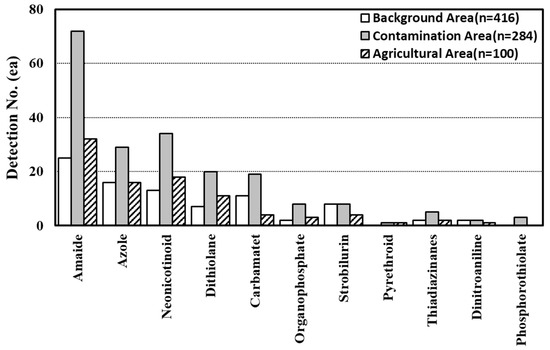 In the survey results, 26 pesticides, including metolachlor, imidacloprid, and alachlor, were detected as being above the LOQ. Metolachlor exhibited the highest detection frequency (10.13%) followed by imidacloprid (8.50%), alachlor (8.13%), tricyclazole (5.88%), isoprothiolane (5.50%), and carbofuran (3.13%). Metolachlor exhibited the highest average concentration (0.0123 μg/L) followed by alachlor (0.0077 μg/L) and imidacloprid (0.0065 μg/L). The distribution status by pesticide class in groundwater is shown in Figure 5. A total of 11 pesticide classes were detected, including the amide class (e.g., alachlor and metolachlor), the azole class (e.g., tricyclazole and oxadiazon), and the neonicotinoid class (e.g., imidacloprid). When the pesticide detection status by measurement network type was compared, relatively higher detection levels were confirmed in the contamination and agricultural areas compared to the background measurement network.