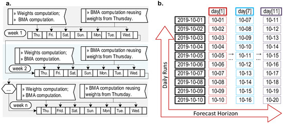 The flowchart of procedures to compute BMA via backtesting simulations is illustrated in (a), and the process to segregate the forecasts made by a rainfall–runoff chain, according to the days of the forecast horizon (day 1, day 2, …, day 11), are exemplified in (b).