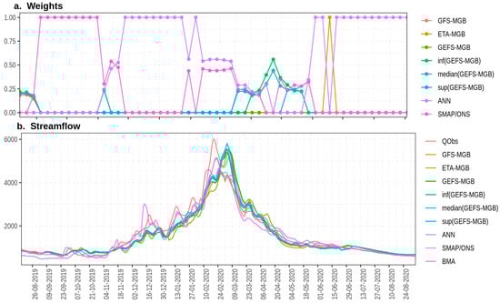 The posterior probability that gives weight , , is also a Gaussian function. For this reason, the measured and forecasted streamflow time series must be Box–Cox transformed [91] to generate normally distributed data before applying the EM algorithm. In this process, we compute a weekly set of dynamic weights, taking into account the last 120 days of both measured and forecasted streamflows. This approach is designed to reflect their recent behavior, acknowledging that the performance of rainfall–runoff models can fluctuate over the course of the year. This is particularly important during periods of significant change in precipitation regime, such as the transition from the rainy season to the dry season. Some studies have shown that the use of multiple sets of weights improves BMA predictions, suggesting that it is a way to accentuate the strengths of the individual ensemble members in capturing the phases of a hydrograph [32]. However, time-variable weights do not prevent ensemble members with low performance from influencing BMA predictions. In fact, the joint contribution of bad ensemble members reduces the BMA performance, even though their weights are low.