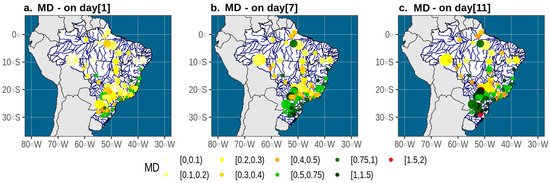 Brazil has large territorial dimensions and lands that make up a significant part of South America. As a result of the Brazilian territorial extension, there is a high diversity of vegetation coverage, land relief, physical and chemical characteristics of soils, land use and occupation, as well as climate conditions [104,105,106], which enable the existence of river basins with different hydrological characteristics. For example, in the Northern Brazilian region, situated within the Amazon rainforest, river basins generate streamflows that are characterized by having a kind of short-term inertia. Meanwhile, in the Southern Brazilian region, where the Atlantic Forest and Pampa biomes predominate, considerable variability in daily streamflows is observed. This high level of short-term variability impacts the streamflow predictability and, consequently, the performance of rainfall–runoff chains. It contributes to the existence of spatial heterogeneity in the BMA model’s predictive performance across the country. For this reason, we investigate the performance of the BMA forecasts for all of Brazil using the MD metric, as illustrated in Figure 6.