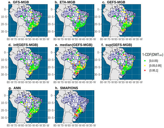 Regarding the predictions from individual rainfall–runoff chains, Figure 7 displays the spatial patterns of the Diebold–Mariano hypothesis test, which is applied to compare the streamflow forecasts from BMA with those of individual ensemble members. In this figure, reservoirs and hydropower plants highlighted in green (or red) are those for which BMA predictions are significantly more (or less) accurate than the ones made by the competing ensemble member. On the other hand, the ones in yellow are those for which there is no statistical difference between predictions from different models. Figure 7 demonstrates that the time series of forecasts performed by GFS-MGB, ETA-MGB, GEFS-MGB, inf(GEFS-MGB), sup(GEFS-MGB), and ANN are significantly less accurate than those made by the BMA in most reservoirs and hydropower plants. In fact, we observe that the number of cases in which the competing ensemble member has an accuracy that is significantly higher than or equal to that of the BMA is quite limited in all regions of Brazil, demonstrating that the predictions that are made according to the Bayesian framework are more consistent and reliable all over the country.
