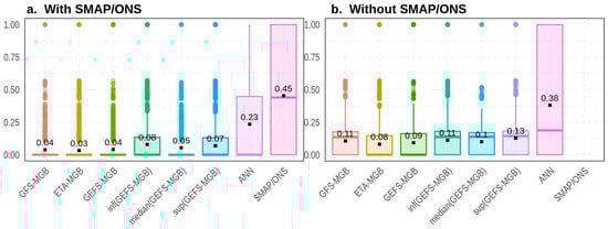 Such evolving behavior impacts the accuracy and efficiency of streamflow forecasts and also affects BMA. This influence is evident in Figure 8, Figure 9 and Figure 10, which display the boxplots of the weights assigned to several rainfall–runoff chains. Figure 8a shows the weights related to 67 hydro reservoirs with natural inflows that are simulated by the SMAP/ONS model without temporal information about when they were computed (i.e., weights computed on different days were grouped by model for a more general evaluation of the results). In this case, the MGB-based chains have weights ranging from 0.03 to 0.08. Their upper limits are also relatively low (below 0.35), with some outliers exceeding 0.5. The similarity in the weights applied to different MGB-based chains, such as GFS-MGB, ETA-MGB, and GEFS-MGB, suggests that without considering the computation time, these chains tend to receive similar weights.