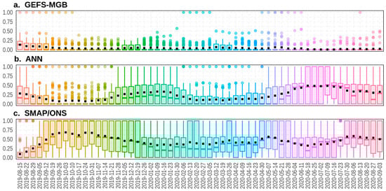 Boxplots of weights computed for (a). GEFS-MGB, (b). ANN, and (c). SMAP/ONS considering the 67 reservoirs and hydropower plants with natural inflows simulated by the SMAP/ONS chain. Black squares represent the average values in each boxplot, and the colored dots represent the outliers.