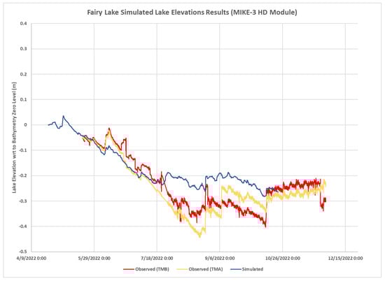 The developed Fairy Lake model was run from 22 April to 22 October 2022. The start time was matched with the time when bathymetry was conducted. It is assumed that the ‘cold’ run (a term used by MIKE-3 to denote a period for the model to stabilize the temperature) finishes on 19 May 2022, when the two mooring stations started measuring the lake elevations and water temperature at various depths. This was conducted as the Lake Elevation and Temperature data were available from 19 May to 22 October 2022.