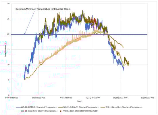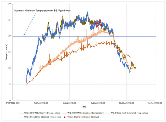 With widespread, ongoing urbanization and as climate change continues, the importance of protecting the water quality of streams and lakes is intensifying. However, while many water quality constituents in lakes and rivers are of overall interest, water temperature is a ‘key’ variable, as temperature influences mixing within a waterbody, influences the acceptability of habitat for flora and fauna, and serves as a guide to the general health of a stream and waterbodies [49]. Figure 7 shows that observation of Cyanobacterial growth occurred when the surface water temperatures exceeded and remained above 20 °C.
