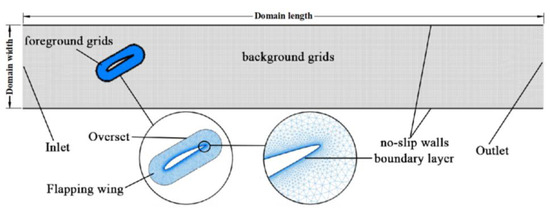 This study employed the simulation software Ansys Fluent 2020 to simulate and analyze the characteristics of two-dimensional incompressible turbulent flow fields. The simulation is based on the Reynolds-averaged Navier–Stokes equations, which are explained in the literature [30]. The turbulent flow model is employed for the resolution of the Navier–Stokes equations, with the relevant equations provided in reference [31]. This work utilizes overlapping grid technology to capture the flow field behind the flapping hydrofoil accurately and optimize computational resources. The adoption of this technique ensures both high precision and efficiency in the numerical simulation. The channel’s computational domain is defined as 800 mm × 5000 mm. In Fluent, the span s of the flapping foil numerical model is set to 300 mm. The pitching center of the flapping hydrofoil is located at a distance of 0.2 times the chord length (c) from the leading edge of the foil. Additionally, the reference point (pivot) for the fluid domain is established 500 mm away from the inlet of the channel. This study divides the computational domain into background grids (rectangular fluid domain) and foreground grids (flapping hydrofoil fluid domain), as shown in Figure 5. Both the foreground and background grids consist of structured grids with a uniform size of 8 mm.